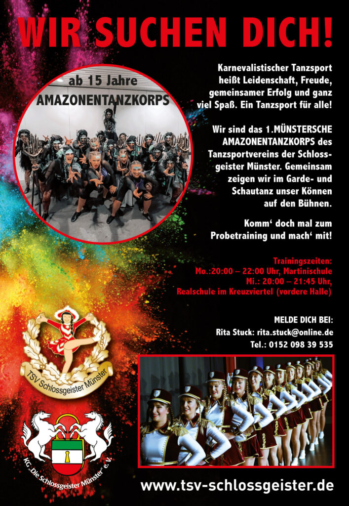 Wir sind das 1.Münstersche Amazonentanzkorps des Tanzsportvereins der Schlossgeister Münster. Gemeinsam zeigen wir im Garde- und Schautanz unser Können auf den Bühnen. Komm‘ doch mal zum Probetraining und mach‘ mit!